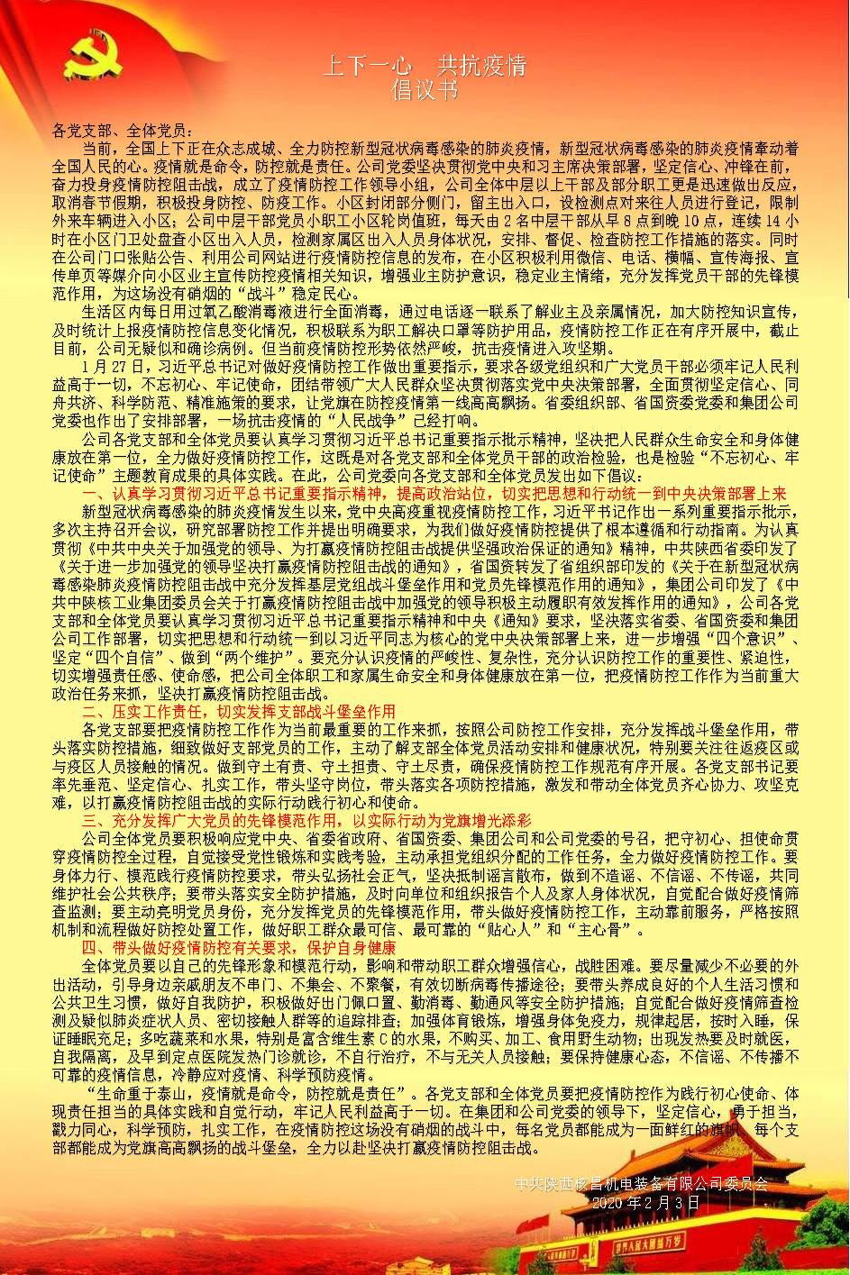 中陜核集團各級黨組織和全體黨員干部:新型冠狀病毒感染的肺炎疫情牽動著全國人民的心。元月下旬以來,集團公司各級領導班子全面安排部署、深入一線指揮,集團公司醫(yī)療系統(tǒng)黨員干部和...