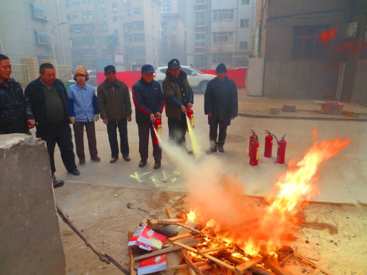 春節(jié)將至,為確保210小區(qū)的安全,咸陽二一零物業(yè)管理有限責(zé)任公司,于2015年2月6日在小區(qū)組織了一場消防滅火演練,許多小區(qū)業(yè)主現(xiàn)場進行了觀摩。上午8:50在12#樓前空地處,由小區(qū)安全員孟貴山同志就滅火器的構(gòu)成、作用及怎樣使用滅火器等相關(guān)知識講解并現(xiàn)場示范。事前物業(yè)公司對消防演練進行了周詳?shù)陌才牛阂髤⒓友菥毜乃腥藛T聽從安排,服從指揮,讓每個職工親身實踐正確使用滅火器滅火。參加的人員包括門衛(wèi)、車棚、巡邏、保潔等各部門的員工。9:00,點火人員點燃了熊熊烈火,消防滅火演練人員3人一組,分為3個組,第一組人員提著滅火器沖到離火焰約2米處對準(zhǔn)熊熊烈火的根部進行高壓噴射,火勢迅速被控制,后面兩組依次輪流進行滅火演練,最后火焰被徹底熄滅了。整個過程緊張有序,取得了較好的效果,受到在場業(yè)主的一致好評。通過本次消防演練,進一步增強了小區(qū)住戶的安全防范意識、完善了消防預(yù)案、提高了消防應(yīng)急救援水平。