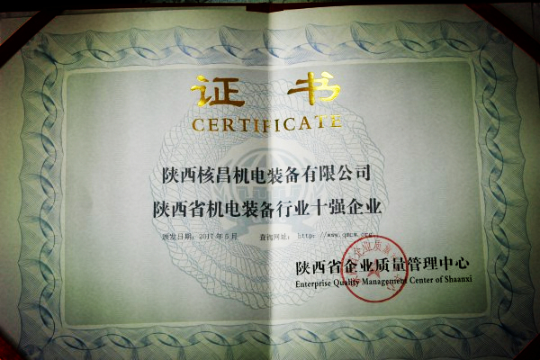 2017年5月,核昌公司被陜西省企業質量管理中心授予“陜西省機電裝備行業十強企業”稱號。