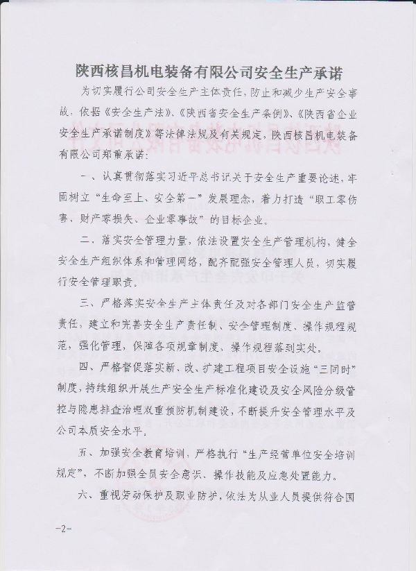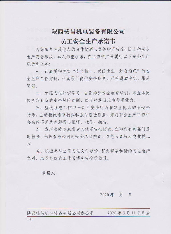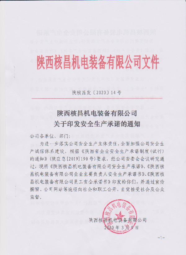 陜西核昌機電裝備有限公司關于印發安全生產承諾的通知